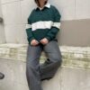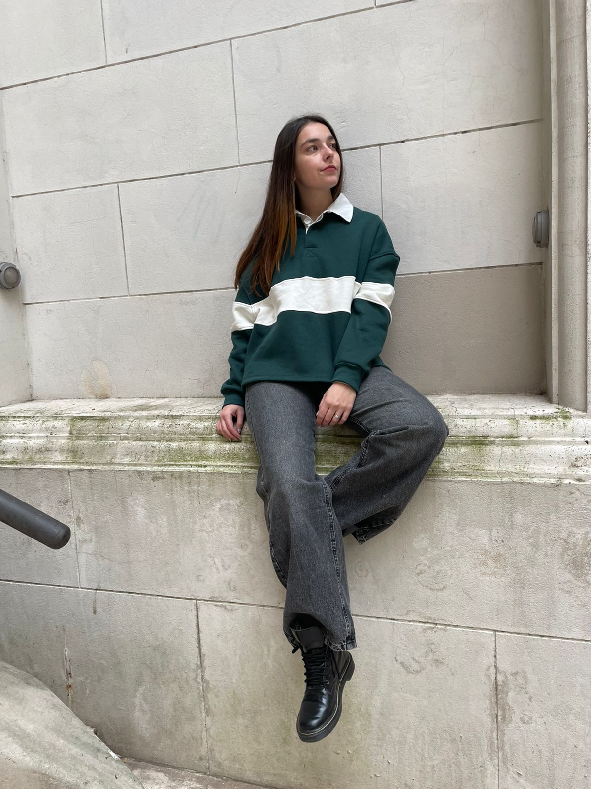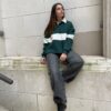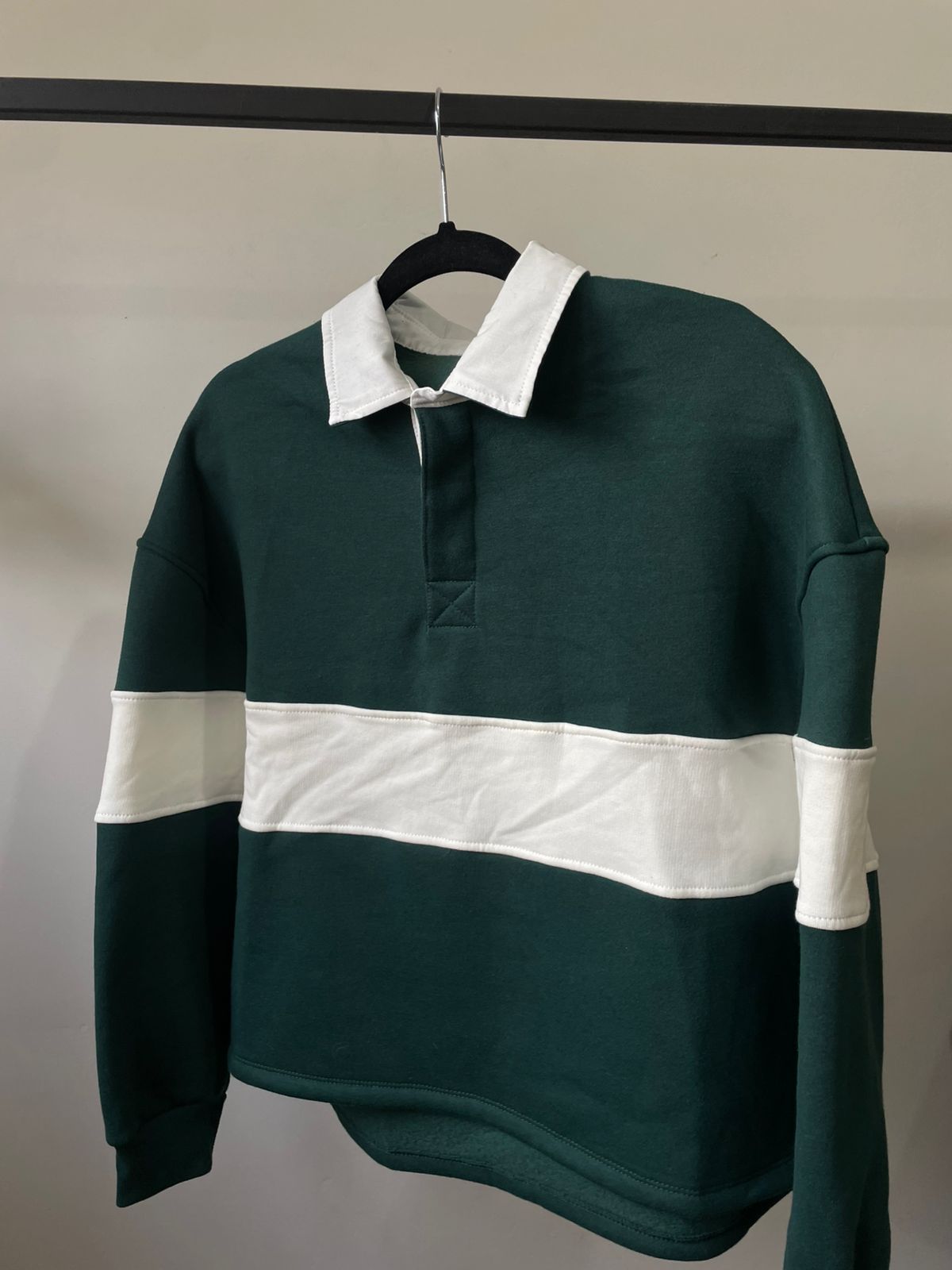 Buzo oversize de frisa invisible con detalles a contratono verde ingles. Modelo con cartera y botones escondidos en el delantero.